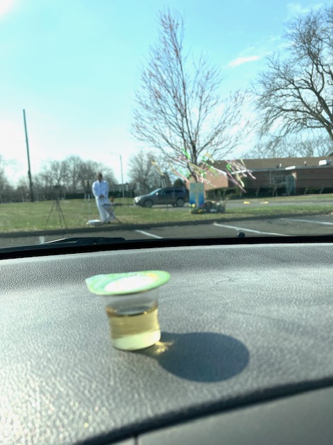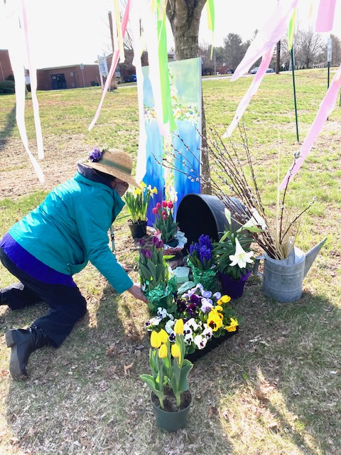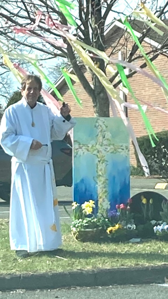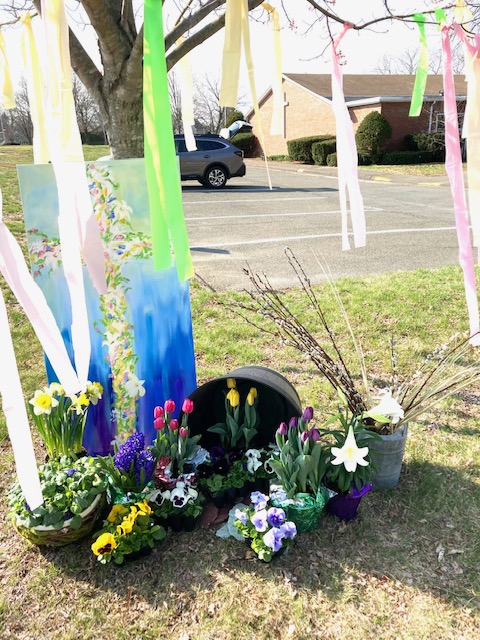 We gathered in the parking lot. We passed out communion cups with wafers. Pastor Rick had the radio transmitter ready and Pat, Bill, others had tee-pee’d the tree with lovely pastel streamers for Easter! Flowers we laid out and Karen brought a lovely painting she had made. The sun shone brightly as did everyone who gathered in His name!